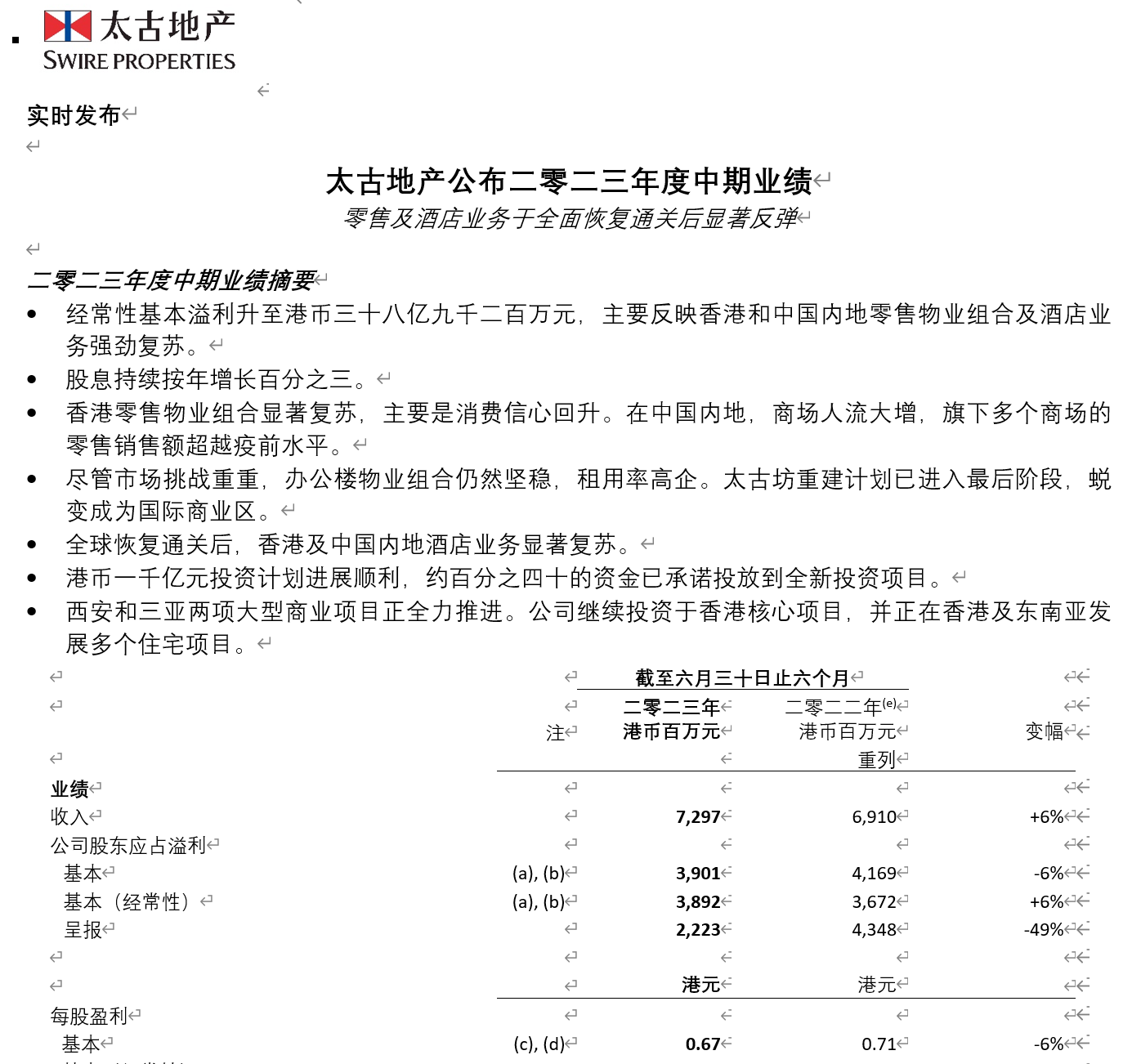太古地产中期业绩报告显示,2023年上半年,其经常性基本溢利为港币38.92亿元,按年增加港币2.2亿元。这主要反映香港及内地的零售物业组合和酒店业务强劲复苏。当中,香港零售物业组合强劲复苏,内地方面,商场人流大增,多个商场的零售销售额更超越疫情前水平。而股东应占基本溢利按年减少港币2.68亿元,主要是因为香港太古城住宅项目停车位的销售推延。上半年物业买卖业务录得轻微亏损,主要源自多个住宅买卖项目的销售及市场推广开支。