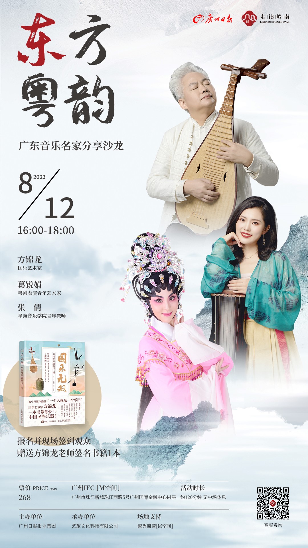8月12日16:00~18:00,广州日报将主办东方粤韵·广东音乐名家分享沙龙。这是广州日报“走读岭南”广州城市文化传承与发展系列活动的首期活动,将邀请世界级国乐艺术家方锦龙与广东本土音乐名家,以“历史讲座+现场演绎”的模式,带大家沉浸式感受广东音乐的艺术魅力。
