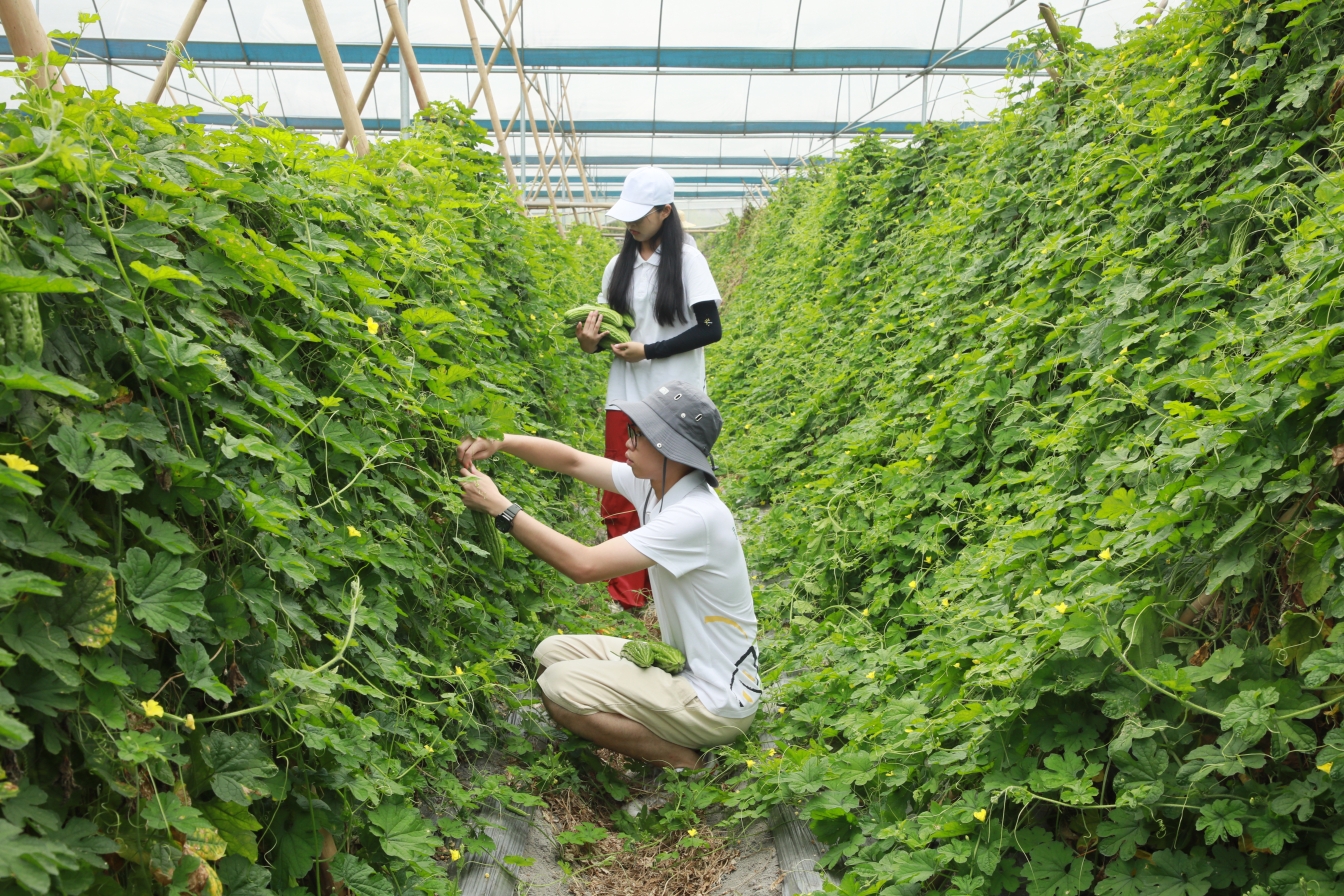 来到红盒子庄园,队员们居住在临时搭建的板房内,办公室则是由员工餐厅临时改造而来。基地条件艰苦,队员们日常还需要早出晚归外出调研、采摘苦瓜等。范裕聪坦言,在跟着基地负责人雷军实地走访的过程中,了解到很多关于土地流转、村民沟通等在乡村振兴过程中实际遇到的难题,这些都是他们此前在学校理论学习中未曾接触过的。“雷总在路上随便走一走,指着路边的一块地、一株草讲一讲故事,我们都感觉受益匪浅。”