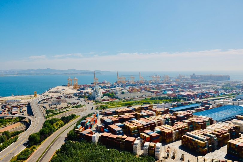 辽东半岛最南端,东濒黄海、西临渤海,拥有诸多天然深水良港的大连因海而兴。站在高处俯瞰大连港大窑湾港区,蔚蓝的海边是繁忙的码头,堆满五彩的集装箱,排列整齐的商品车即将从这里发往世界各地。