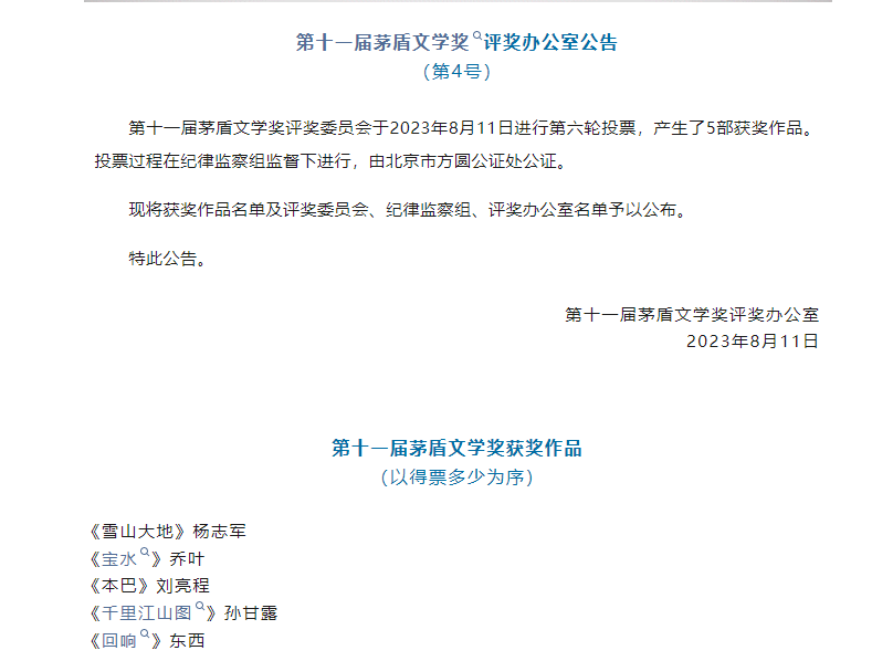 8月11日,第十一届茅盾文学奖评奖办公室公布了获奖作品,分别是:《雪山大地》(杨志军)、《宝水》(乔叶)、《本巴》(刘亮程)、《千里江山图》(孙甘露)、《回响》(东西)。