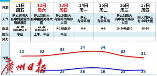 8月11日,广州市三防总指挥部办公室与市气象局、广东省水文局广州水文分局对广州市未来七天的气象水文情况进行了会商。预计,11-12日受低涡和西南气流影响,广州有中到强雷雨局部暴雨,并伴有强雷电、8级左右短时大风和短时强降水等强对流天气;13日受西南气流影响,雷雨仍较明显;14-15日雨势减弱,16日后又再次加强。
