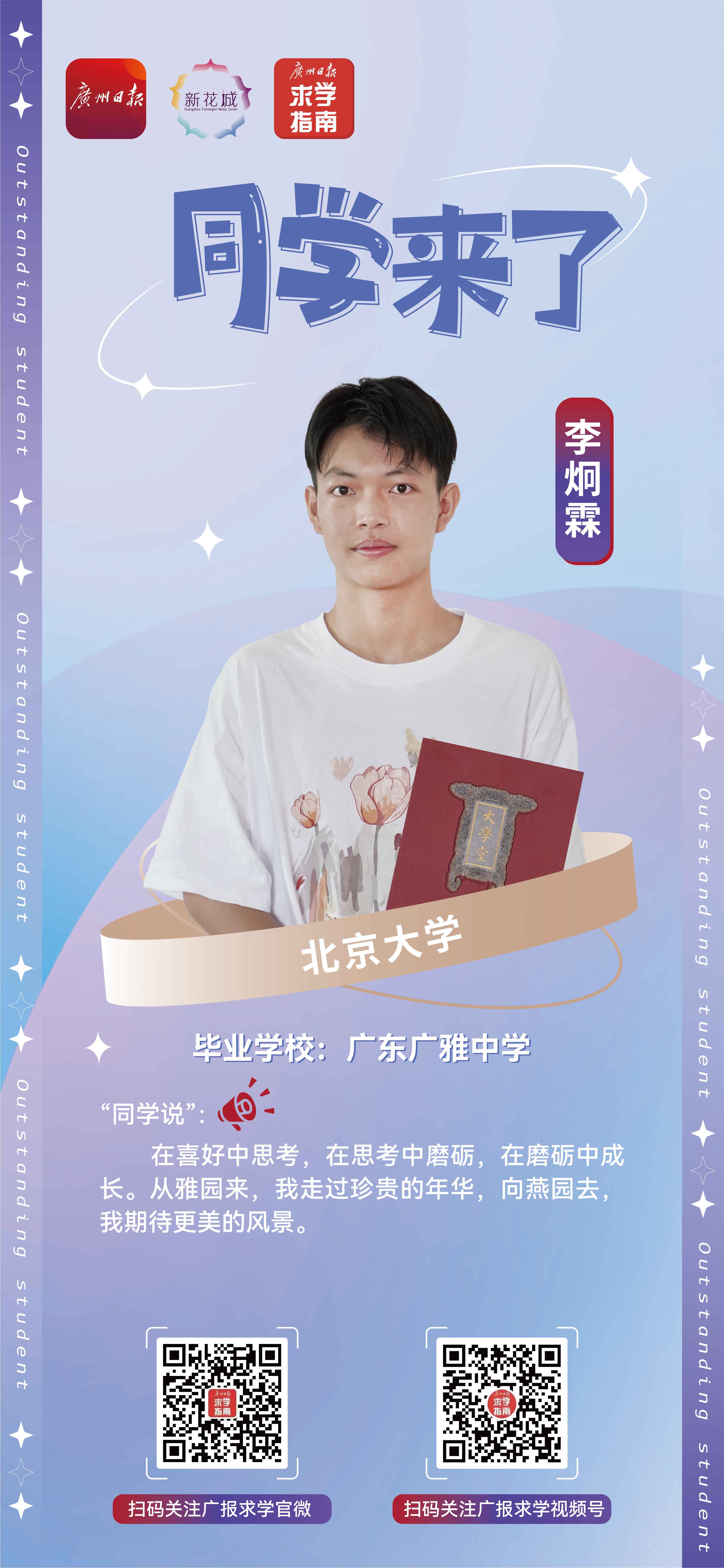 本期“同学来了”,求学君请来广东广雅中学毕业生、北京大学化学专业2023级新生李炯霖同学。有着两年化竞经验的他形容,竞赛路,如走夜路,需要足够的热爱、勇气和毅力,才能走得久、走得远,走到有光的地方。