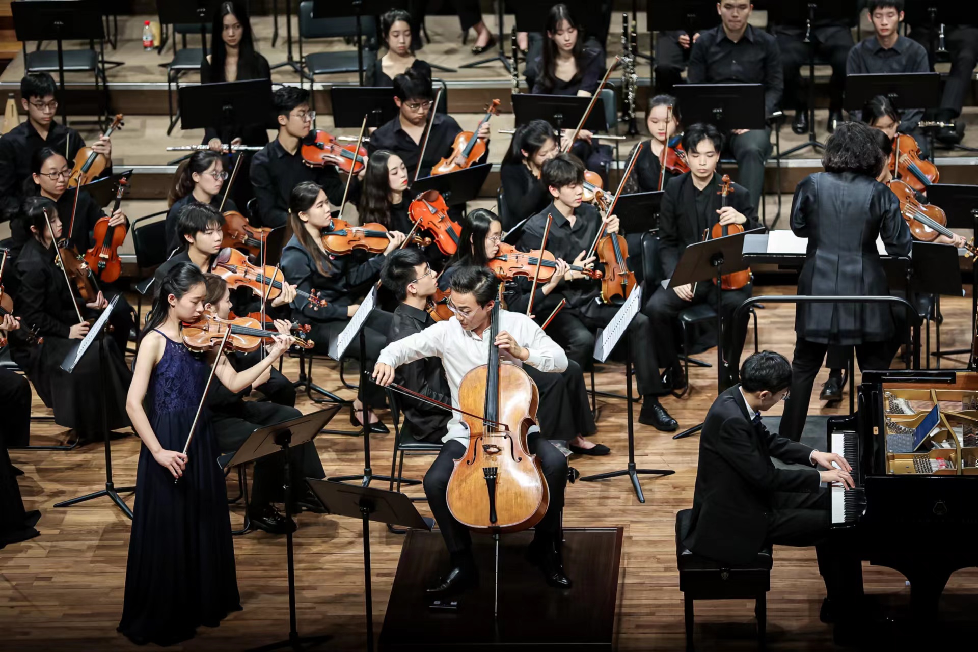 尤其是贝多芬的三重协奏曲,这首协奏曲为三位独奏家而作,因此由来自粤、港、澳三个地区的乐手分别担任独奏。这首协奏曲的独奏部分对于顶尖的专业音乐家来说都具有挑战性,而GBAYO将此重任委以三位屡获殊荣、备受赞许的年轻乐手,他们也以出色的表现给观众留下了深刻印象。