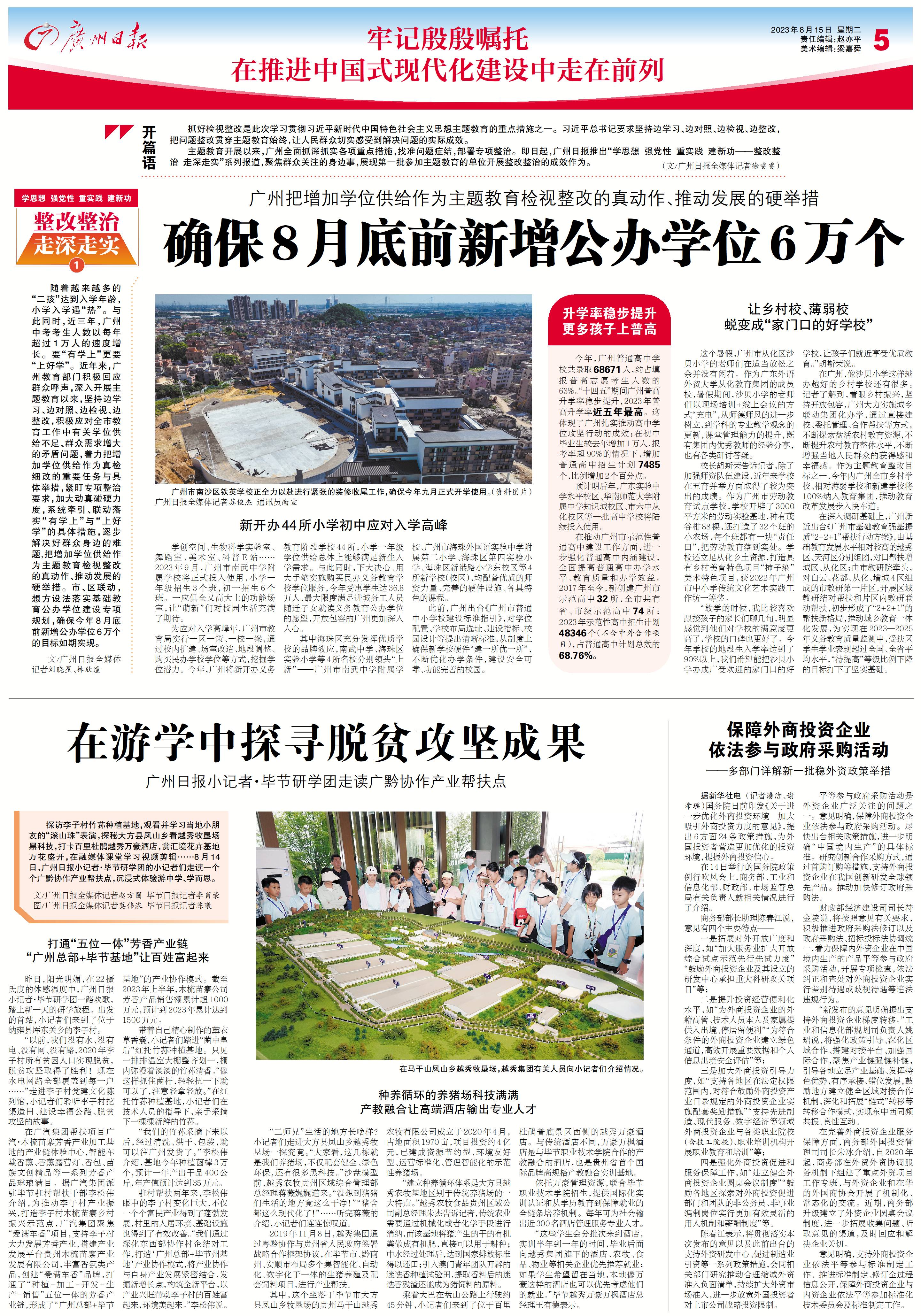 随着越来越多的“二孩”达到入学年龄,小学入学遇“热”。与此同时,近三年,广州中考考生人数以每年超过1万人的速度增长。要“有学上”更要“上好学”。近年来,广州教育部门积极回应群众呼声,深入开展主题教育以来,坚持边学习、边对照、边检视、边整改,积极应对全市教育工作中有关学位供给不足、群众需求增大的矛盾问题,着力把增加学位供给作为真检细改的重要任务与具体举措,紧盯专项整治要求,加大动真碰硬力度,系统牵引、联动落实“有学上”与“上好学”的具体措施,逐步解决好群众身边的难题,把增加学位供给作为主题教育检视整改的真动作、推动发展的硬举措。市、区联动,想方设法落实基础教育公办学位建设专项规划,确保今年8月底前新增公办学位6万个的目标如期实现。