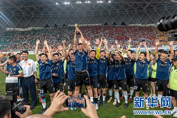 8月12日,香港明星足球隊隊員在一起慶祝。新華網發(龍建睿 攝)