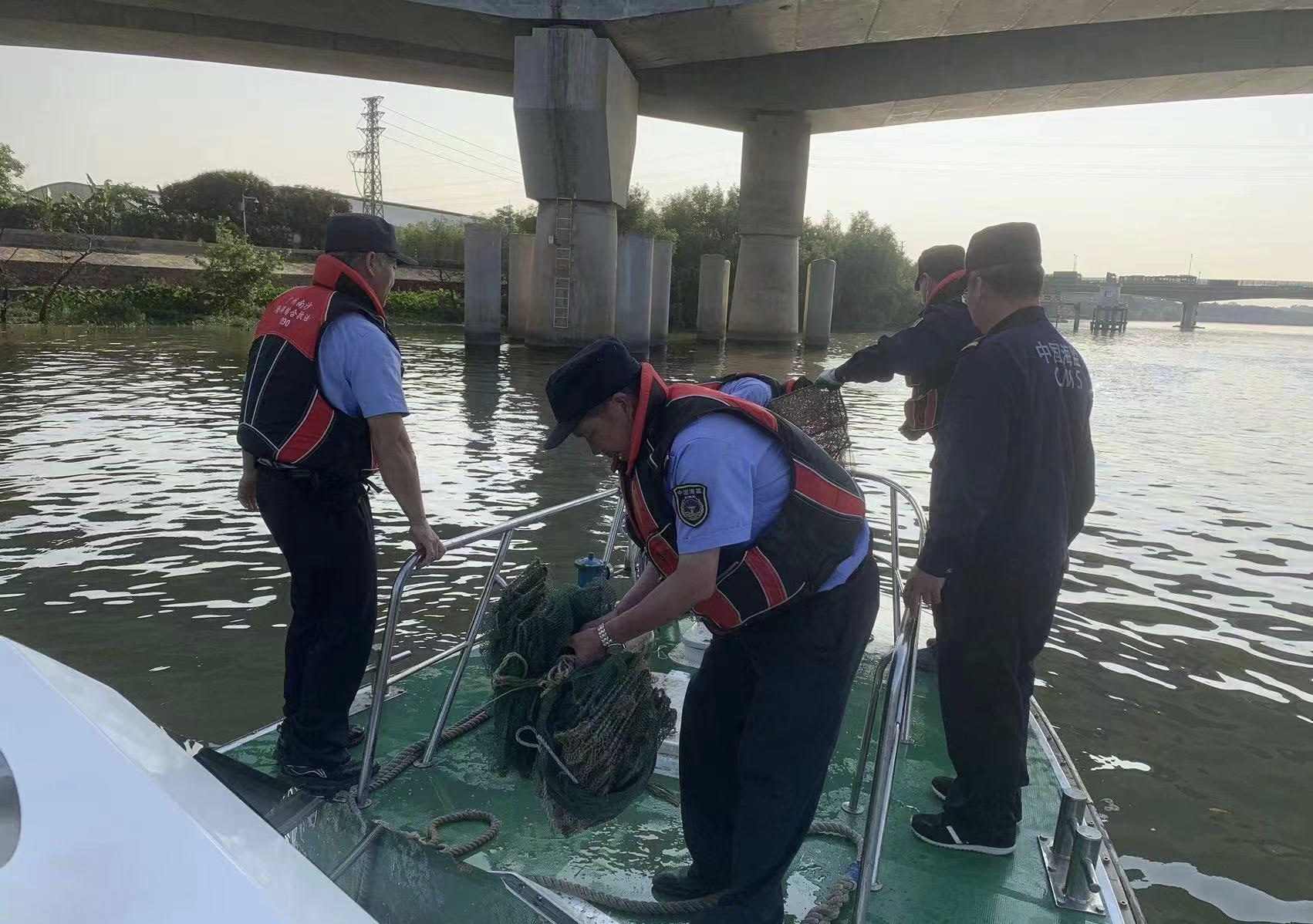 伏季休渔期间,加强休渔期海域巡查,重点突出对交界水域、偷捕高发水域的执法监管,严打休渔期间的偷捕行为。番禺区多部门联合开展渔业安全交叉执法、“渔政亮剑2023”、伏季休渔、“商渔共治2023”等专项执法行动,全力保持渔业执法高压态势,筑牢海上安全防线。伏击休渔期间,共查获“三无”船11艘,清理违规渔具180余件。