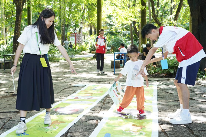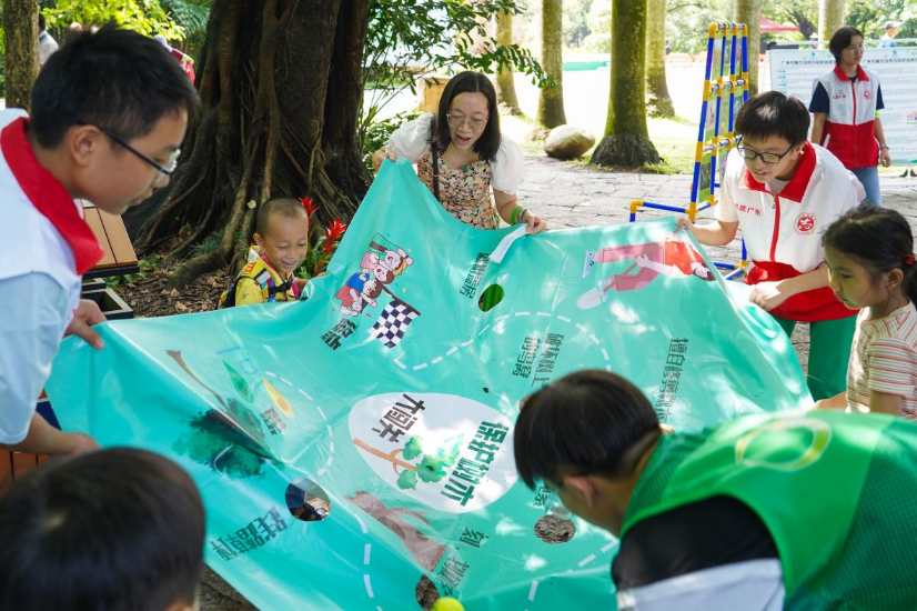 在园内的小广场上,一队粤港澳青少年志愿者正在向游园的市民群众派发生态环境保护宣传资料,并以形式新颖的趣味互动游戏吸引了众多市民群众驻足参与,现场气氛活跃。在志愿者们的耐心指引下,市民群众积极参加不同摊位活动,包括识别外来入侵物种、树木保护知识大闯关等,了解树木保护相关知识并赢取奖品。