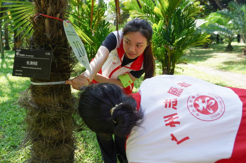△志愿者在华南国家植物园的棕榈园开展树木观察。