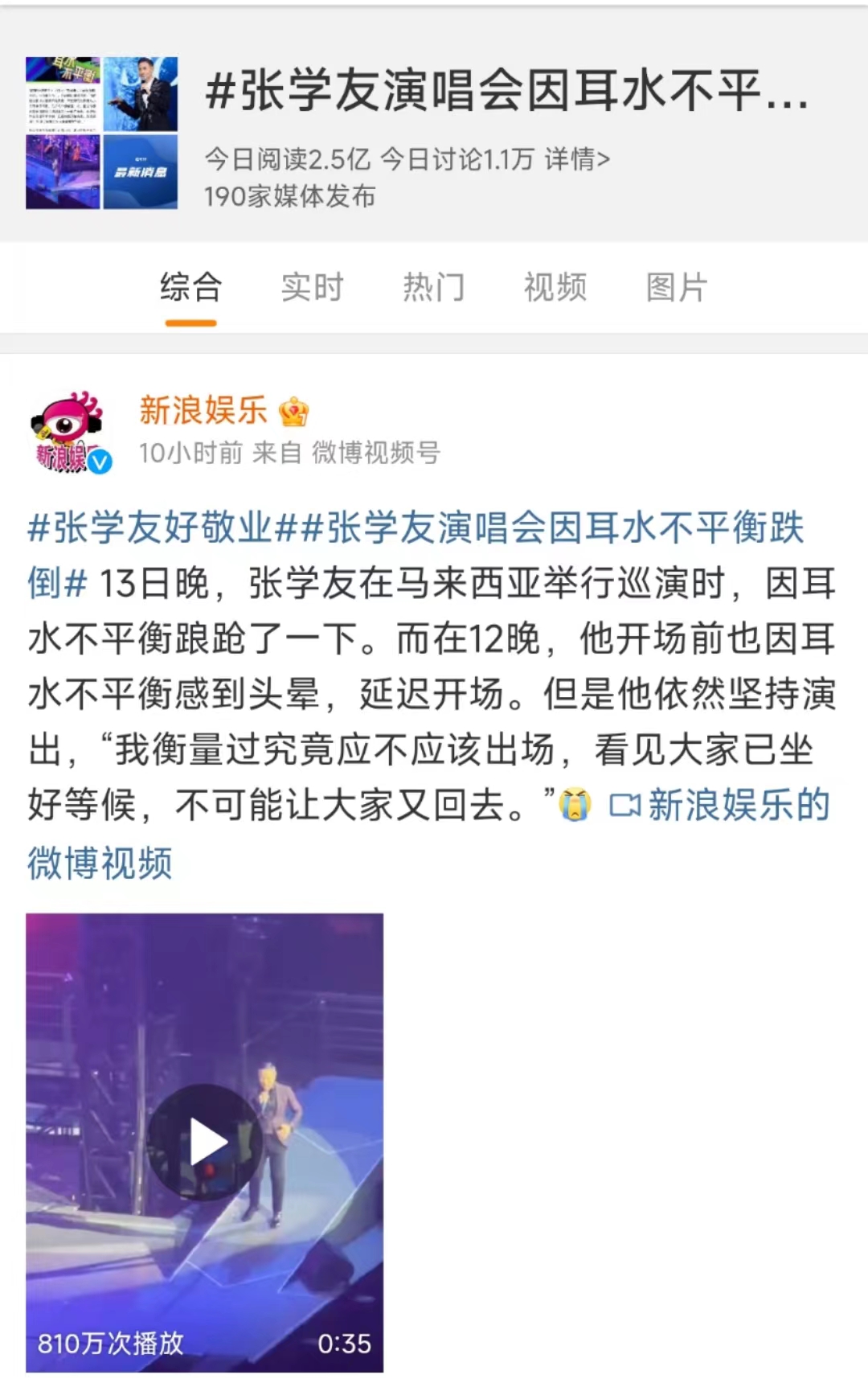 8月13日晚,知名歌手张学友在马来西亚举行巡演时,在舞台上踉跄了一下。张学友随后解释,自己从小就有“耳水不平衡”,几乎每年都会发一次。
