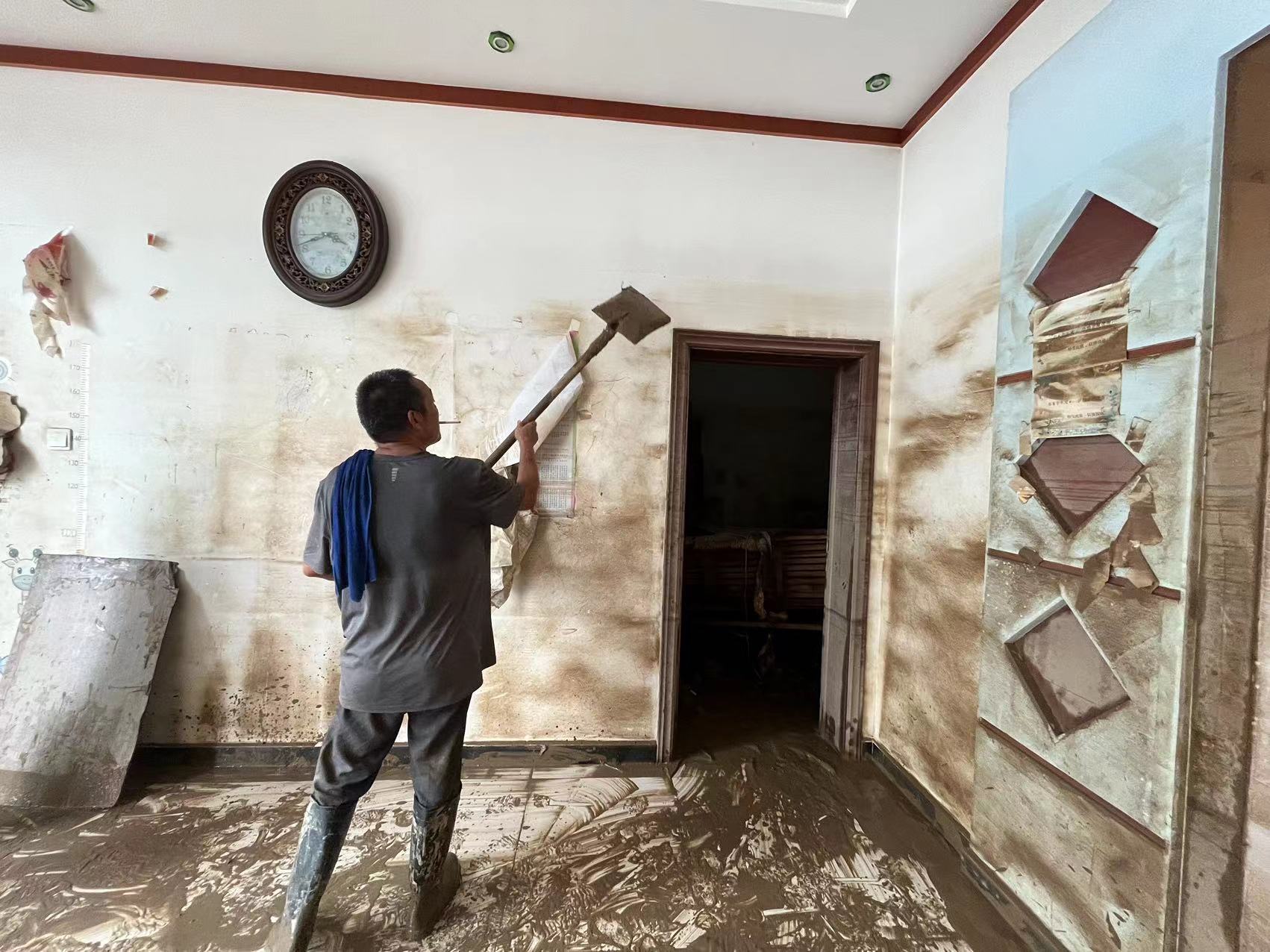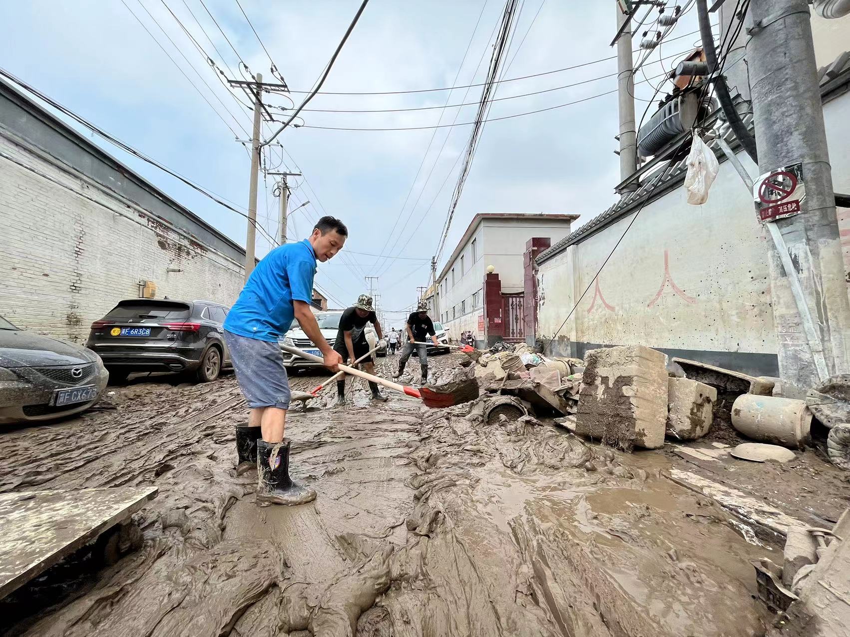 (河北涿州。村民们用爱德捐赠的工具进行清淤工作)