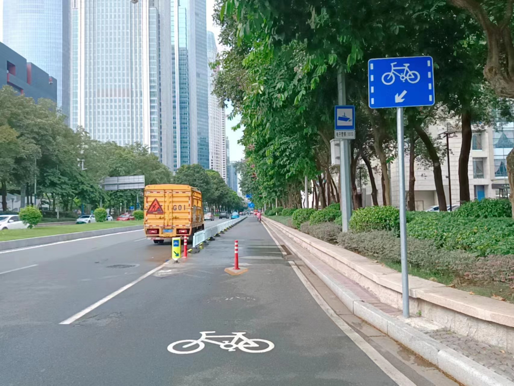 怎样保障非机动车道的通行安全,减少机动车占用非机动车专用道的情况?广州交警在非机动车道始端增设软性警示柱,并配合3D警示标线,以警示非机动车驾驶人留意警示柱,减少碰撞风险。