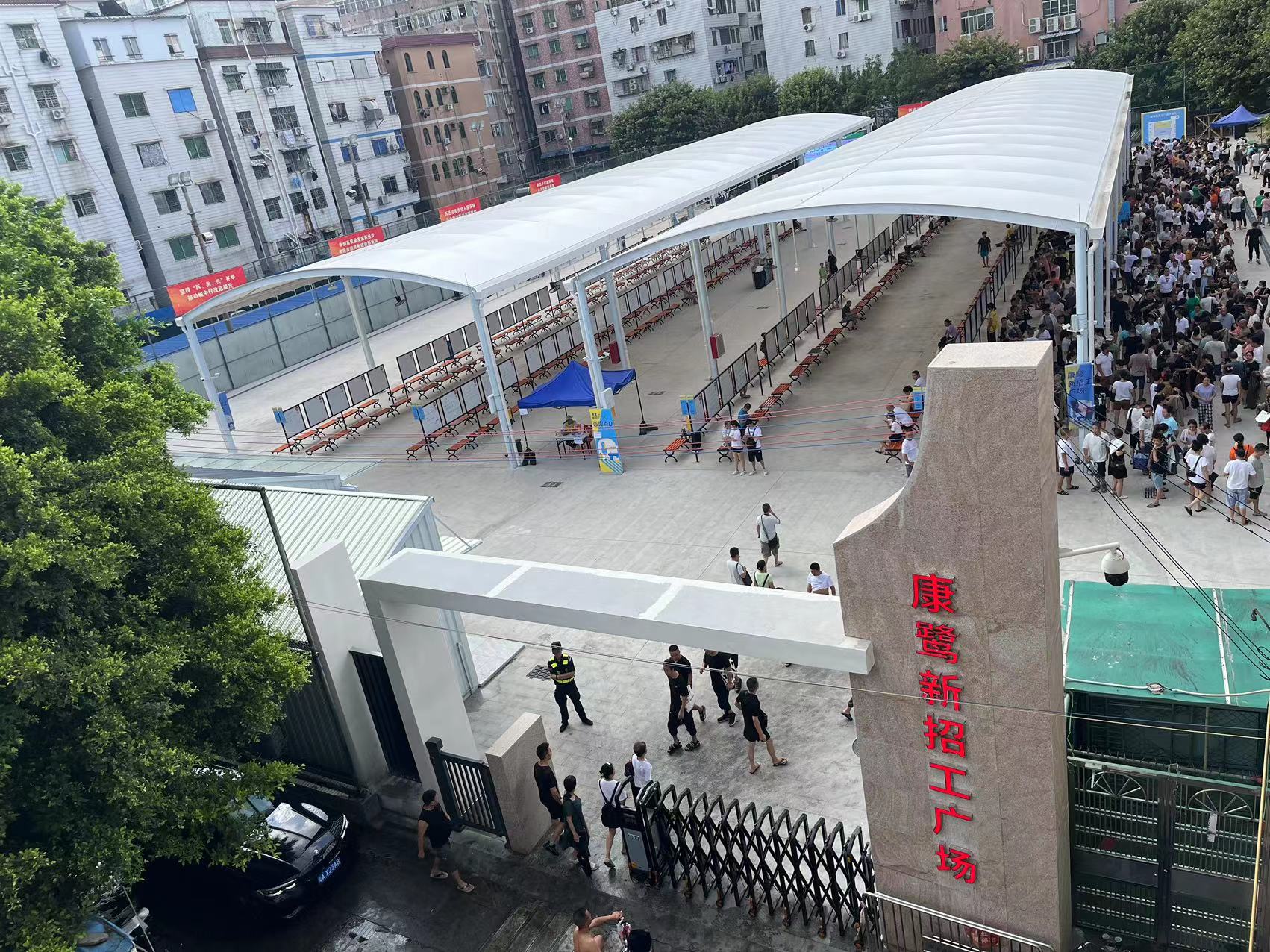 跟原来的“招工一条街”相比,这里不仅宽敞,设有240个带椅子和白板的档位,还搭建了大型棚顶,安装了数十台风扇,日晒雨淋都不影响招工。