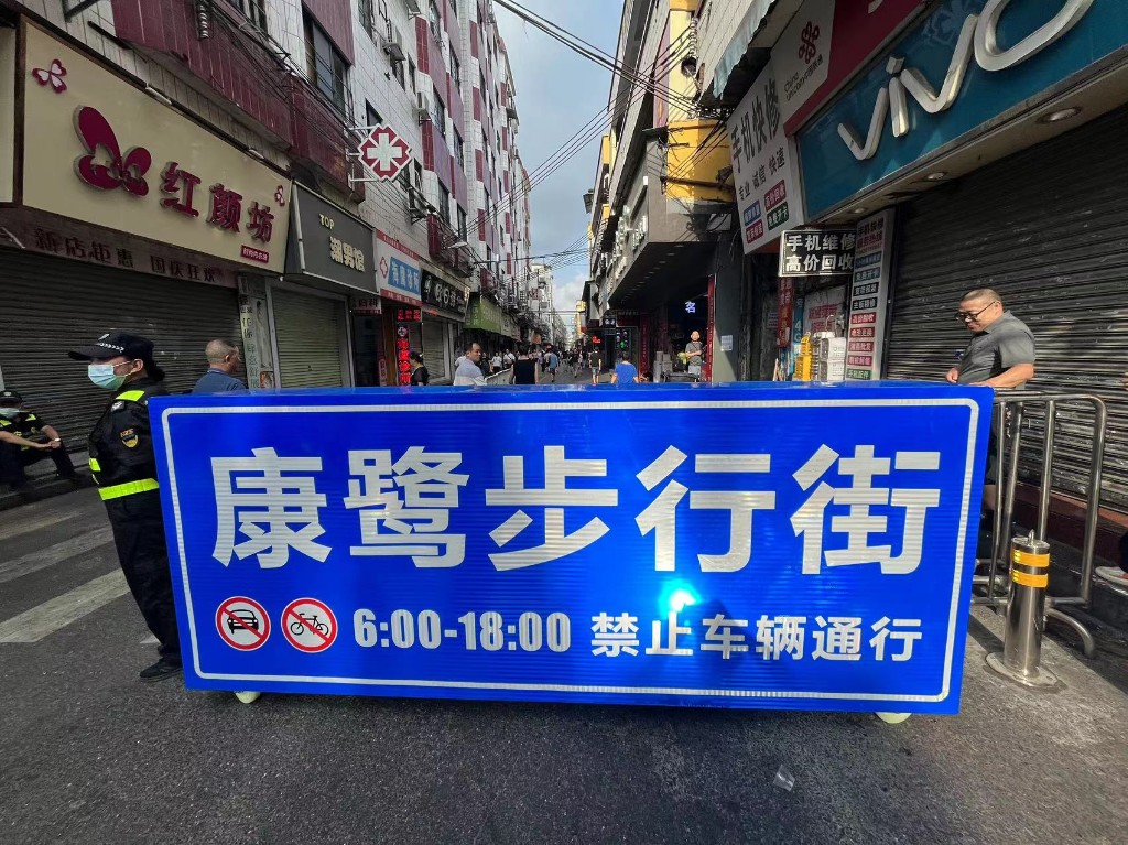 而原来的“招工一条街”就变身成为康鹭步行街,大街东西两个出入口都有醒目的路障,上面写着:6时-18时禁止车辆通行。偶尔有骑电动自行车或自行车的人员想进入步行街,均被保安员劝阻并绕行。现场保安员介绍,在6时-18时,机动车、电动自行车和自行车都不能通行。保障片区运行的垃圾收运车,以及需要入步行街内搬运大件物品的车辆等经申请后可以通行。