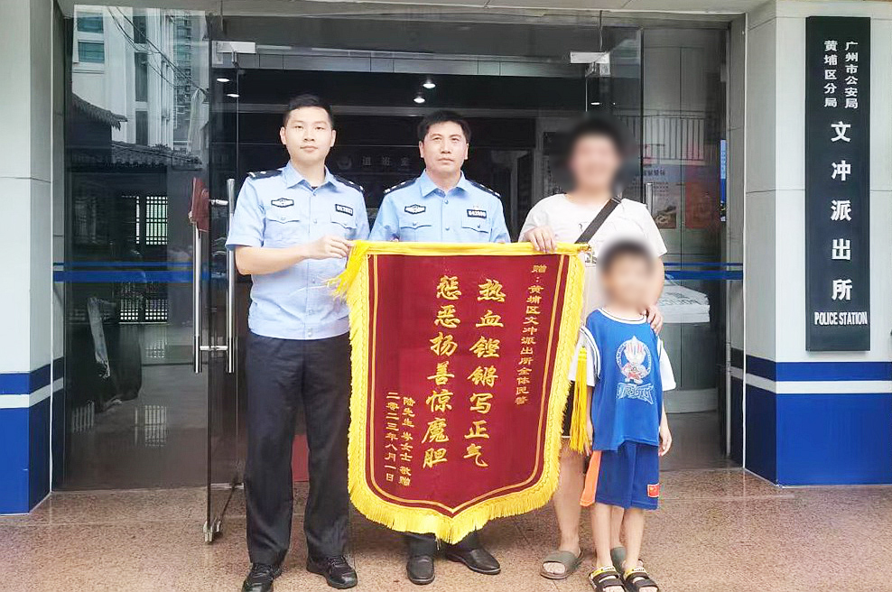 看到失而复得的电动自行车,刘先生和岑女士喜笑颜开,十分感激民警。8月7日,岑女士的丈夫陆先生和儿子到文冲派出所,向民警送上锦旗。