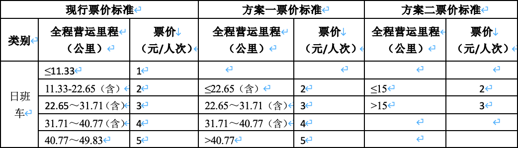 2.方案二(日班车线路基础票价单一票制方案)。优化内容:全程营运里程小于或等于15公里的线路票价为2元,大于15公里的线路票价为3元。