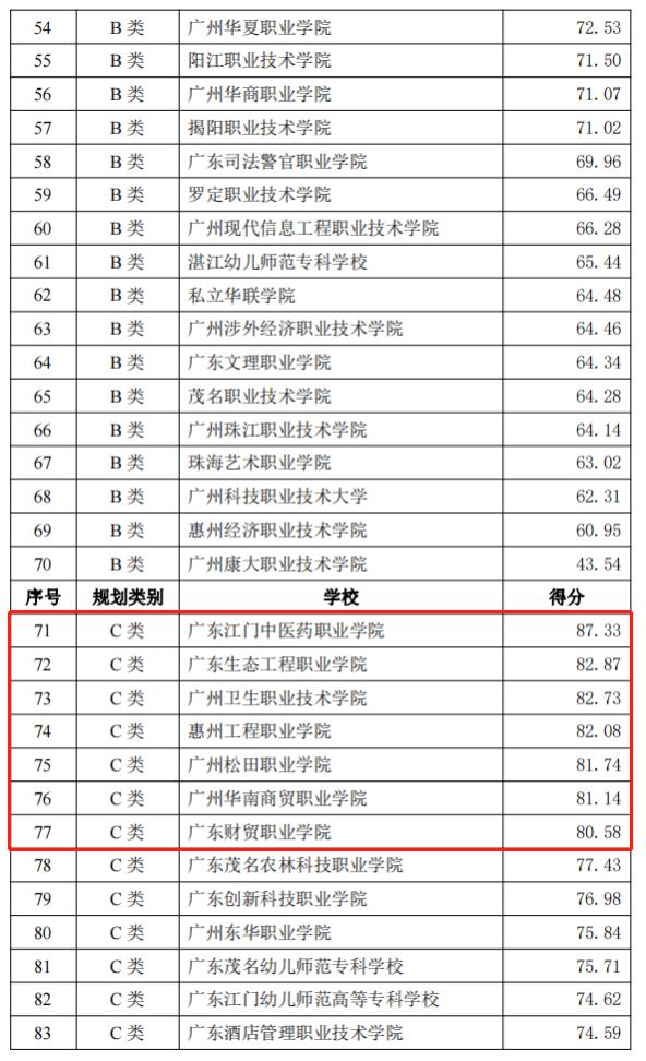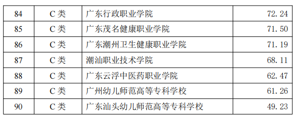 C类也有7所学校得分超过80分,前五名是:广东江门中医药职业学院87.33分、广东生态工程职业学院82.87分、广州卫生职业技术学院82.73分、惠州工程职业学院82.08分、广州松田职业学院81.74分。