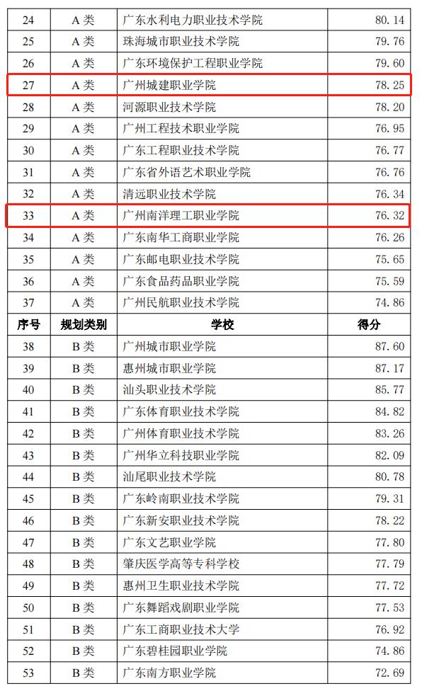 广州城建职业学院位居A类第27位,得分78.25分,在民办高校中领先,它和广州南洋理工职业学院一同构成民办院校的第一方阵,排名超过广东食品药品职业学院、广州民航职业技术学院等国家“双高计划”建设院校。