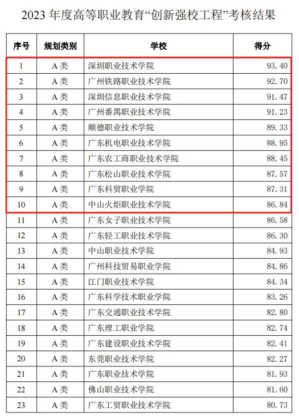 8月16日,广东2023年度高等职业教育“创新强校工程”考核结果正式公示,公示期为5天。此次一共有90所高职院校参与评价,基本涵盖省内所有高职院校,院校数量与去年持平。规划类别划分为A、B、C三类,分别涉及37所、33所、20所学校。记者即时梳理了榜单上的亮点。