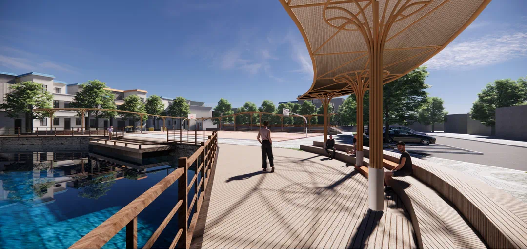 针对缺乏主入口及登山旅游标识的问题,设计增加入口村石、老虎头景点标识指引,利用当地竹构融入周边乡土环境,兼顾农产品销售、候车、休憩等功能。风水塘周边分布着祠堂、村居及旧水平学堂,但后来乱停乱放、杂草丛生、场地闲置,规划对其重新布局,打造成集篮球场、休憩亭、村民广场、停车场于一体的复合空间,通过艺术化竹构介入公共空间形成亮点,吸引人停留。