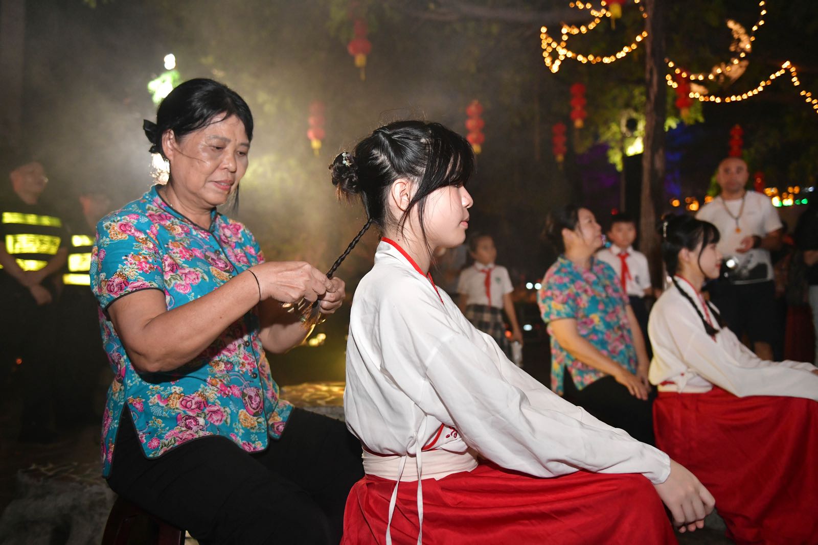 传统“拜七娘”仪式、成人及笄礼的再现也是本届乞巧节的一大亮点。自2005年广州天河举办“第一届广州乞巧文化节”,该习俗便存在,是广州极具代表性的传统文化习俗。在笄礼的最后环节,舞蹈《对影穿针》借助对民俗风情的记录与刻画,巧妙展现了劳动人民的勤劳与智慧。