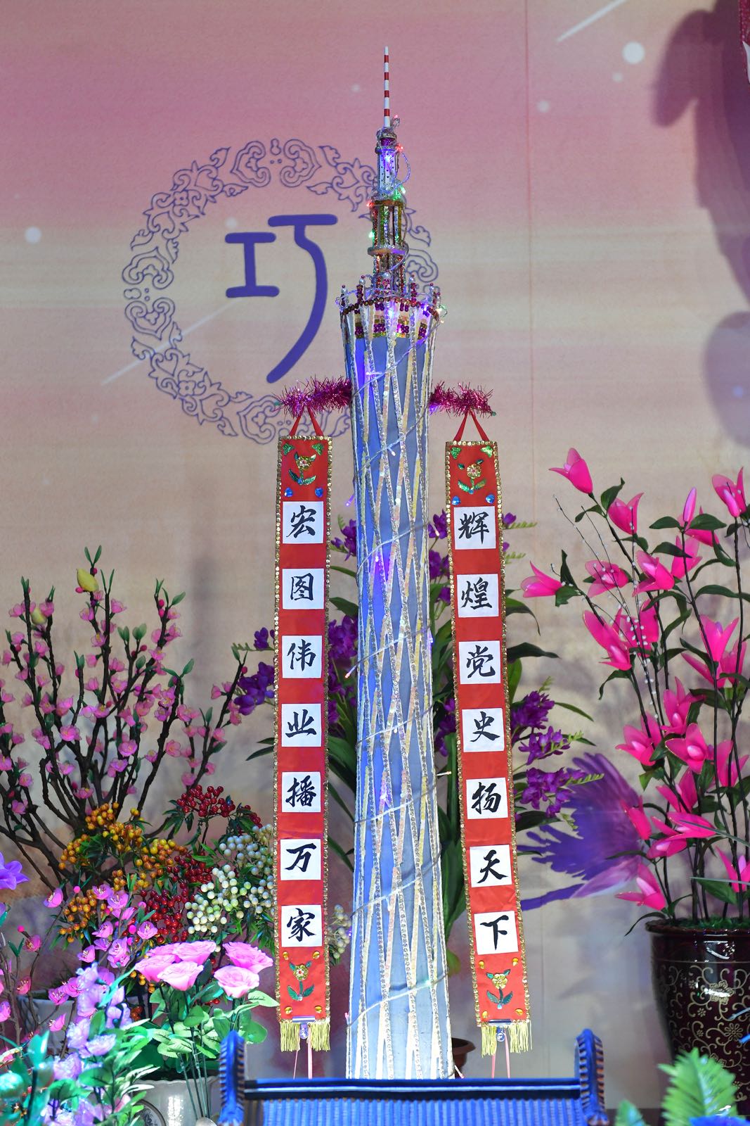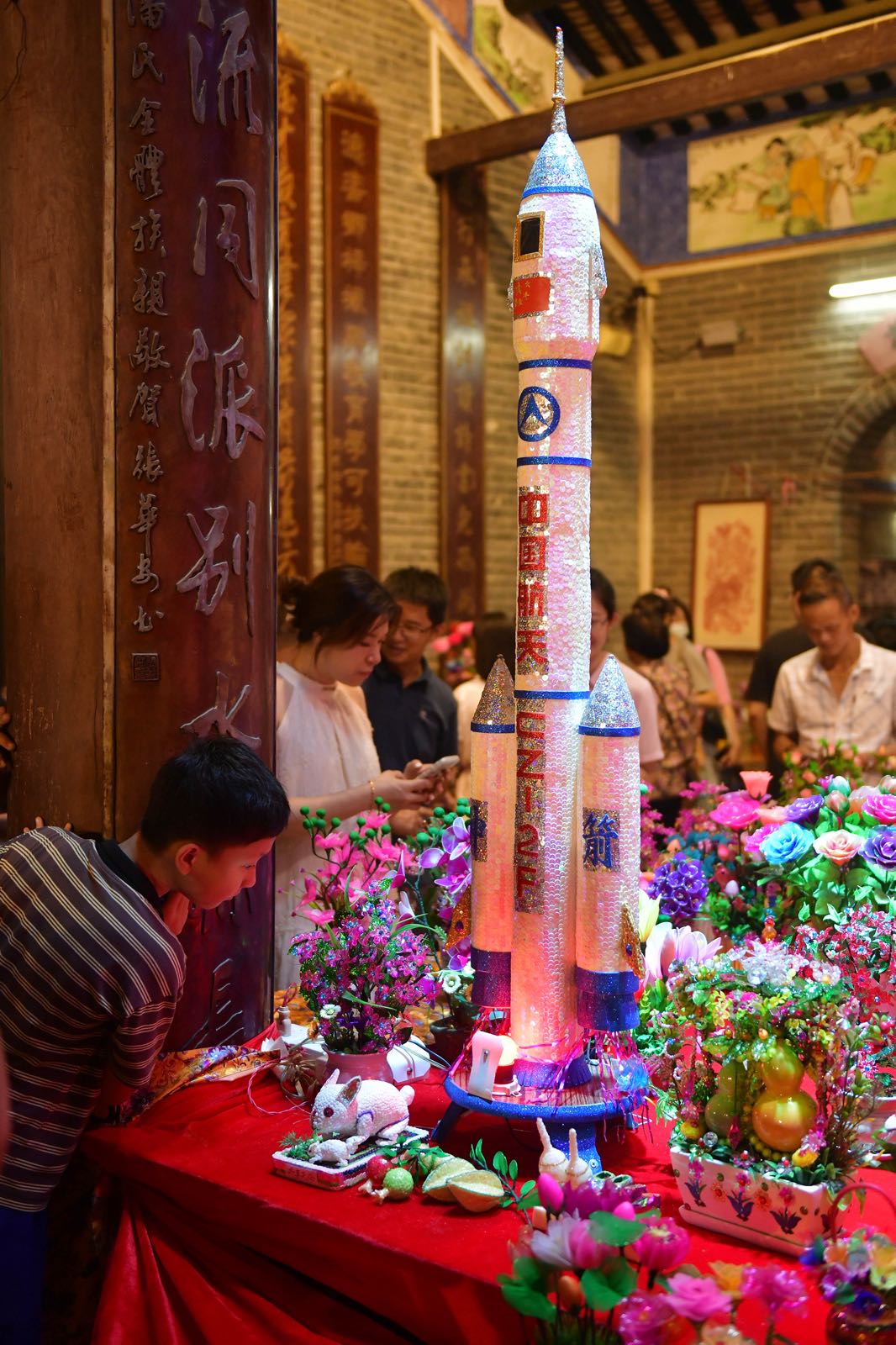 广州市天河区非物质文化遗产保护中心办公室主任王佳美介绍,今年乞巧节,珠村共设有五个摆七娘展示点——明德堂、七社饭堂、北帝古庙、沂江潘公祠和元德陈公祠,每一个展示点的供案都各有不同,但一样地精致灵巧,趣味盎然。走进这些展示点,各式各样精巧的手工艺品有序陈列在贡台上,远看,精心雕琢的古建筑、鹊桥相会等七夕文化元素熠熠生辉,走到近旁仔细端详,瓜果、花卉栩栩如生、真假难辨。