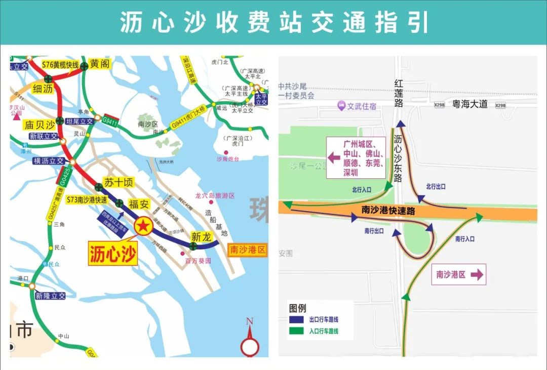 沥心沙站往返南沙港方向双向匝道开通后,经沥心沙往返南沙港区的车辆通行时间可缩短10分钟,四类及以上货车可免费通行!