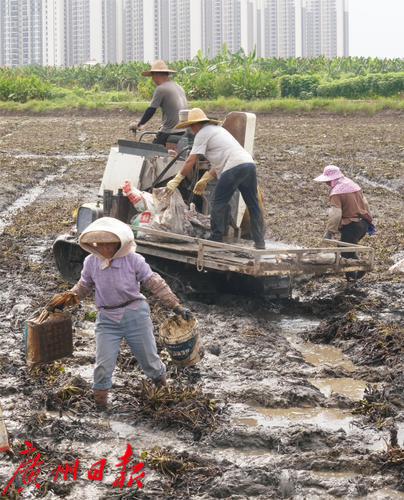 在横沥前进村村民冯巨垣的菱角塘中,塘水已经抽干大半,菱角正漂浮在塘泥之中,几十位村民穿着雨鞋做好防护准备,在塘中手工采收着菱角。