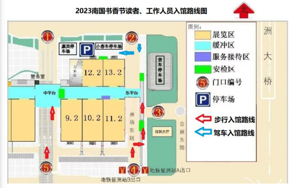 读者乘坐地铁、公交车、的士等交通工具到达中国进出口商品交易会展馆(地铁可从8号线琶洲站A、B口出入、公交到达琶洲公交站),通过4号门进入,按指引通过东平台进行检票、安检,方可进入会场,该入口靠近13.2号馆。