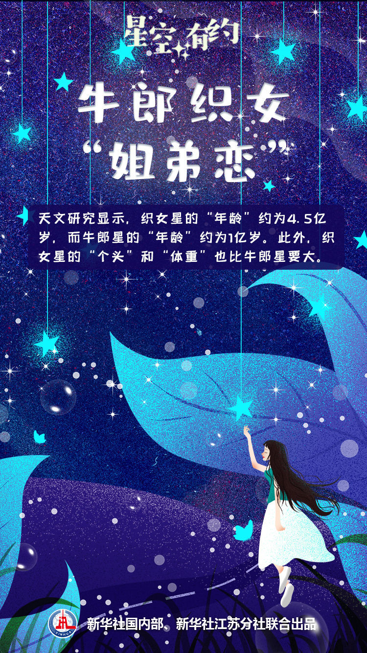 天文研究显示,牛郎星与织女星不仅是“异地恋”,还是“姐弟恋”。王科超介绍,织女星的“年龄”约为4.5亿岁,而牛郎星的“年龄”约为1亿岁。织女星的“个头”和“体重”也比牛郎星要大。织女星的质量约为太阳的2.1倍,赤道直径约为太阳的2.8倍;牛郎星的质量约为太阳的1.7倍,赤道直径约为太阳的1.8倍。因为自转速度极快,织女星和牛郎星都把自己“甩”成了椭球状。