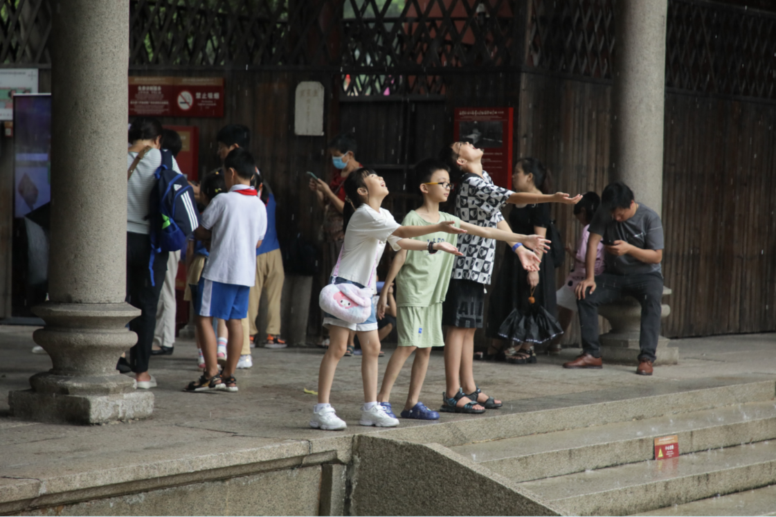 农讲所,小朋友伸手接从屋檐上掉落的雨水。