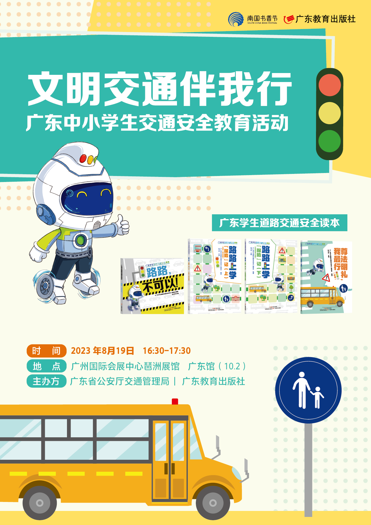 广东省公安厅交通管理局和广东教育出版社联合举办的“文明交通伴我行——广东中小学生交通安全教育活动”于2023年8月19日在广州国际会展中心琶洲展馆广东馆主会场圆满举行。活动展示了广东省中小学交通安全教育的成效与出版成果,展望下一步深化中小学交通安全教育的新篇章。