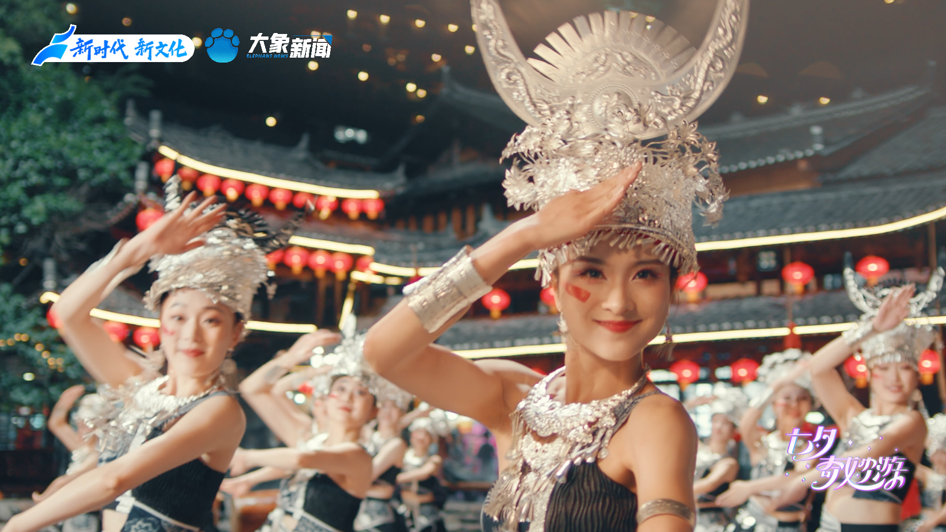 “无银无花不姑娘,有衣无银不盛装。”这句苗家民谚,展现出苗家银饰的隆重和独特文化审美。在第一篇章中,千户苗寨的热闹中,一段风姿灵动、风情万种的苗家姑娘舞蹈,将初见的心动不露声色地表达。
