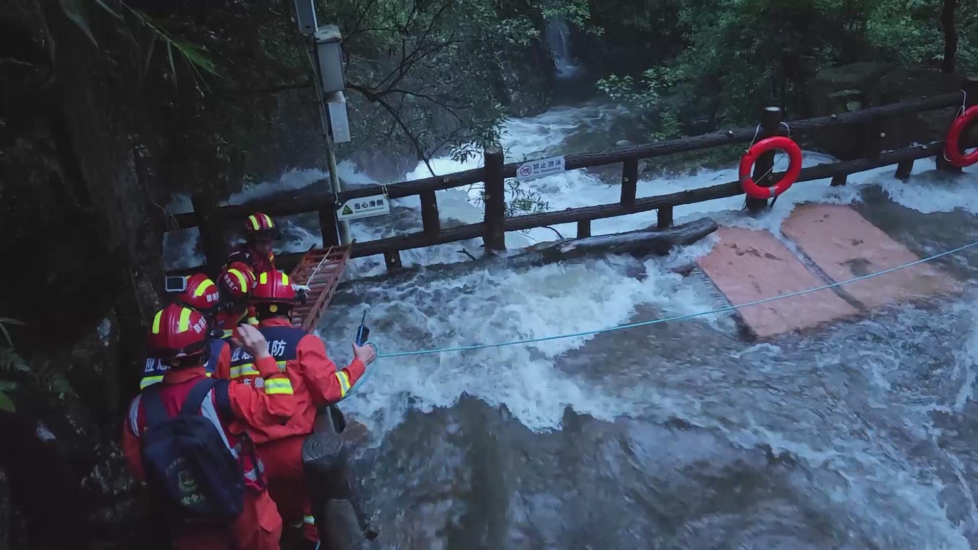 消防救援人员了解到,受连日来的强降雨影响,该溪谷上游水位上涨,雨水从水闸溢出,造成了此次的洪涝。溪谷的另一侧有7名被困群众,消防救援人员随即开展紧急救援。一名消防救援人员携带绳索通过攀爬边上的围栏到达对岸,另外的消防救援人员则在岸边用消防梯搭好落脚点,以此构建好救援通道。