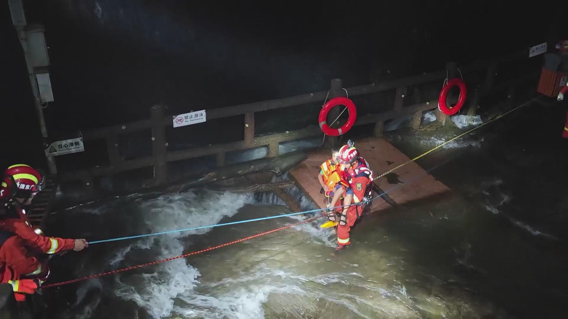 随后,消防救援人员合力依靠绳索把救生衣运输到对岸。在为被困群众做好安全措施后,消防救援人员依次护送其横渡溪谷。大约过了半小时,所有被困群众被安全转移,无人员受伤。