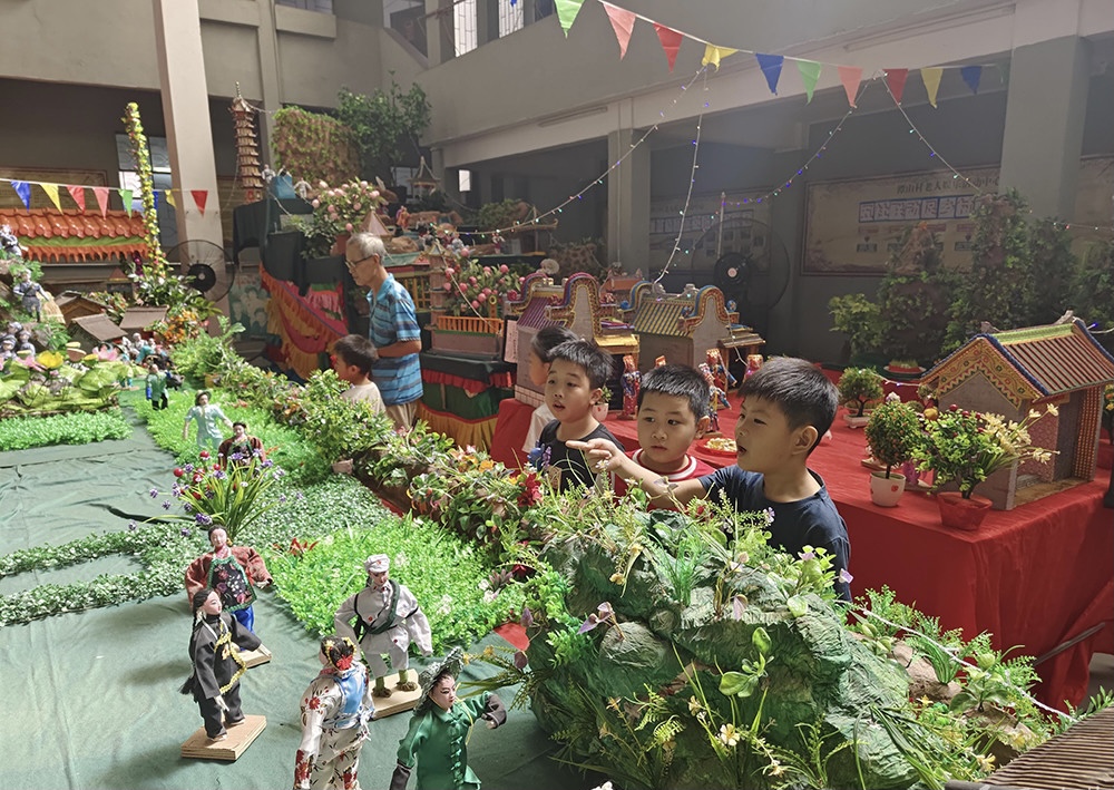 “你看这唐僧四师徒造型很好看啊,火焰山好像会喷火。”8月21日上午,记者来到潭山村综合文化中心,看到一群孩童被现场各种美轮美奂的乞巧贡案所吸引,不时发出惊呼声。而今年92岁的潭山村乞巧传承人许冠其拄着拐杖忙着在现场打点。当他见到孩童满脸惊讶的表情时,不禁露出欣慰的笑容。