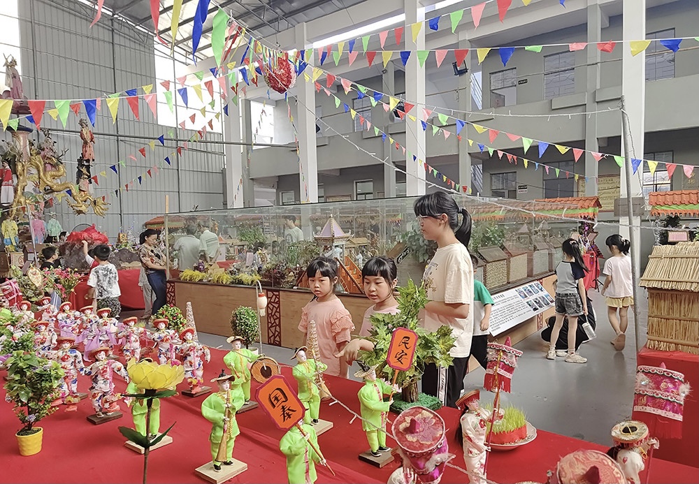 记者看到,前来观赏乞巧的观众除了上了年纪的老人,还有很多家长专门带着小朋友感受七夕文化氛围。来自潭山村许小姐除了带着孩子认真观看每一个乞巧贡案,还耐心地向孩子讲解背后的故事。“乞巧是我们潭山村的传统文化,现在趁着暑假带小朋友学习乞巧文化,也希望这样的传统文化能够代代相传。”