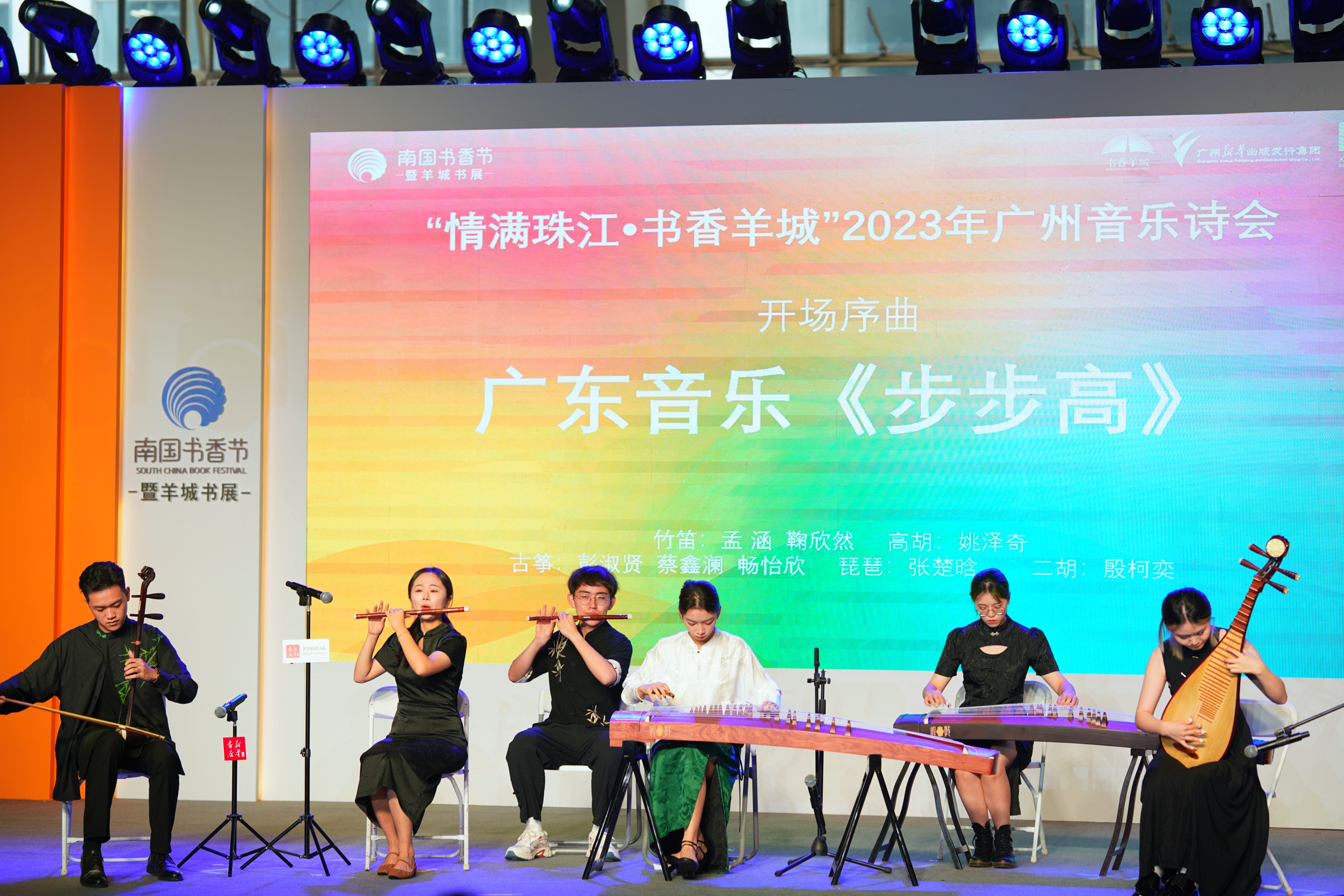弦歌扬雅韵,诗乐绘情深。音乐诗会在广东音乐《步步高》的民乐演奏中拉开序幕。“镬耳高墙的岭南,榕树的气根像自梳女散开的发髻,南风天潮湿了珠江两岸,淅沥淅沥的雨走在路上,粤曲敲打芭蕉……”