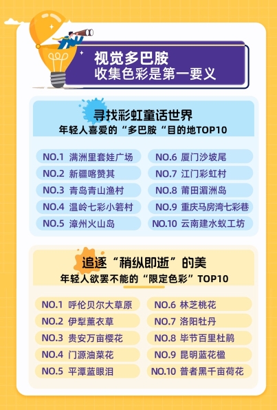 年轻人对“多巴胺”的偏爱已经从穿搭蔓延到旅行,对于越来越多的年轻人来说,旅行不是目的,在旅途中获得快乐才是意义。沿途收集五彩缤纷的美景、为演唱会或赛事赴一座城、邂逅博物馆里的“显眼包”们,都可以成就一段完美的“多巴胺”旅行。