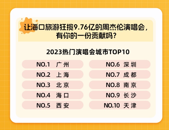 蓬勃发展的演唱会为目的地旅游带来不可估量的经济效益,超过30位演艺人员前来举办演唱会,助力广州登上热门演唱会城市榜首。周杰伦演唱会帮海口狂揽9.76亿元,不仅达到海口端午假期旅游收入的3倍,甚至比五一小长假的旅游收入也高出1亿元。