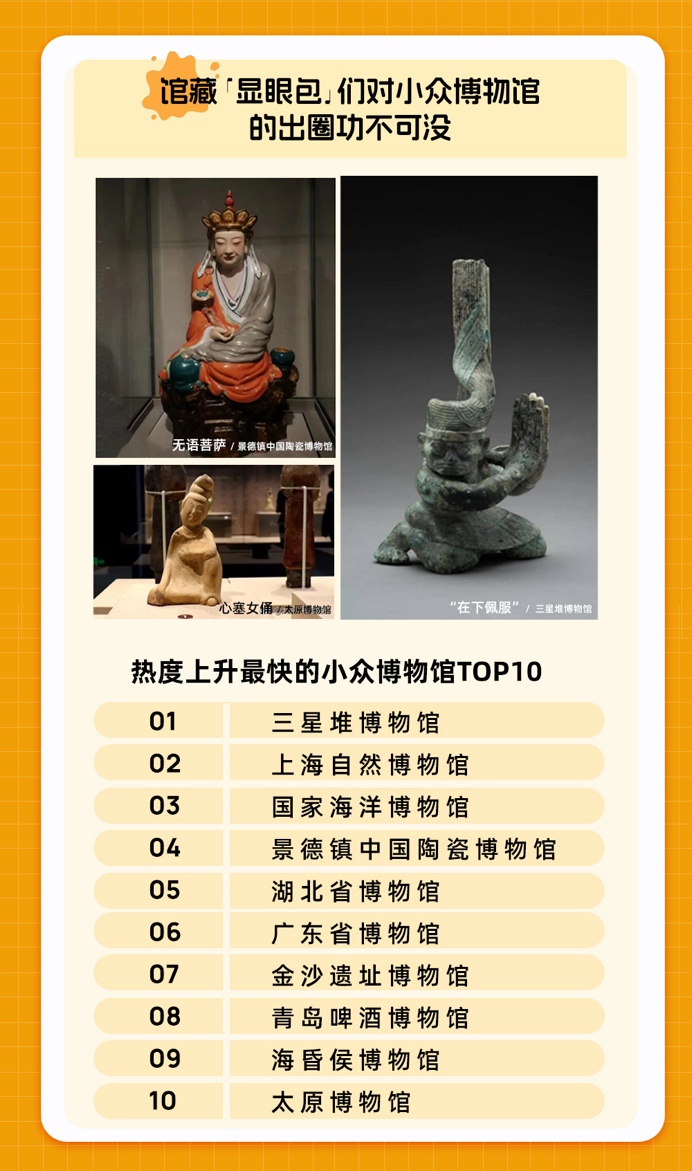 不久前刚开放新馆的三星堆博物馆在热度上升最快的小众博物馆榜单中荣登榜首,即使曾经去过,也有不少年轻人愿意为了新馆二刷甚至三刷。“无语菩萨”以表情包届的“顶流”身份横空出世,让景德镇中国陶瓷博物馆一举冲入前五。