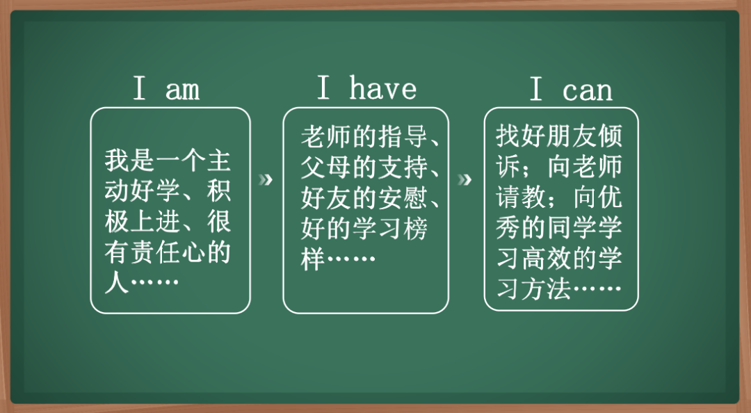 例如,小林同学期末考试成绩不理想,觉得离目标越来越远,逐渐丧失信心,整天焦虑、紧张。这时,可以用3I理论尝试帮助他解决问题。第一步:I am我是一个具备什么优势和经验的人?第二步:I have 我有什么外在资源、支持和机会?第三步:I can我能做什么?