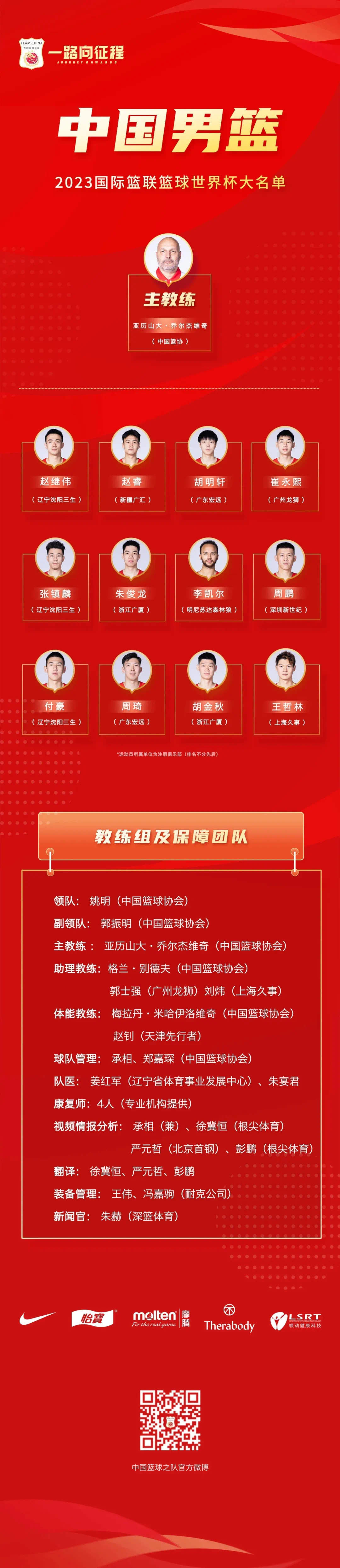 22日晚,中国篮球协会公布了2023国际篮联男篮世界杯中国男篮参赛名单,共包括赵继伟、赵睿、胡明轩、崔永熙、李凯尔、张镇麟、周鹏、朱俊龙、付豪、周琦、王哲林、胡金秋等12名球员。中国篮协主席姚明担任领队。