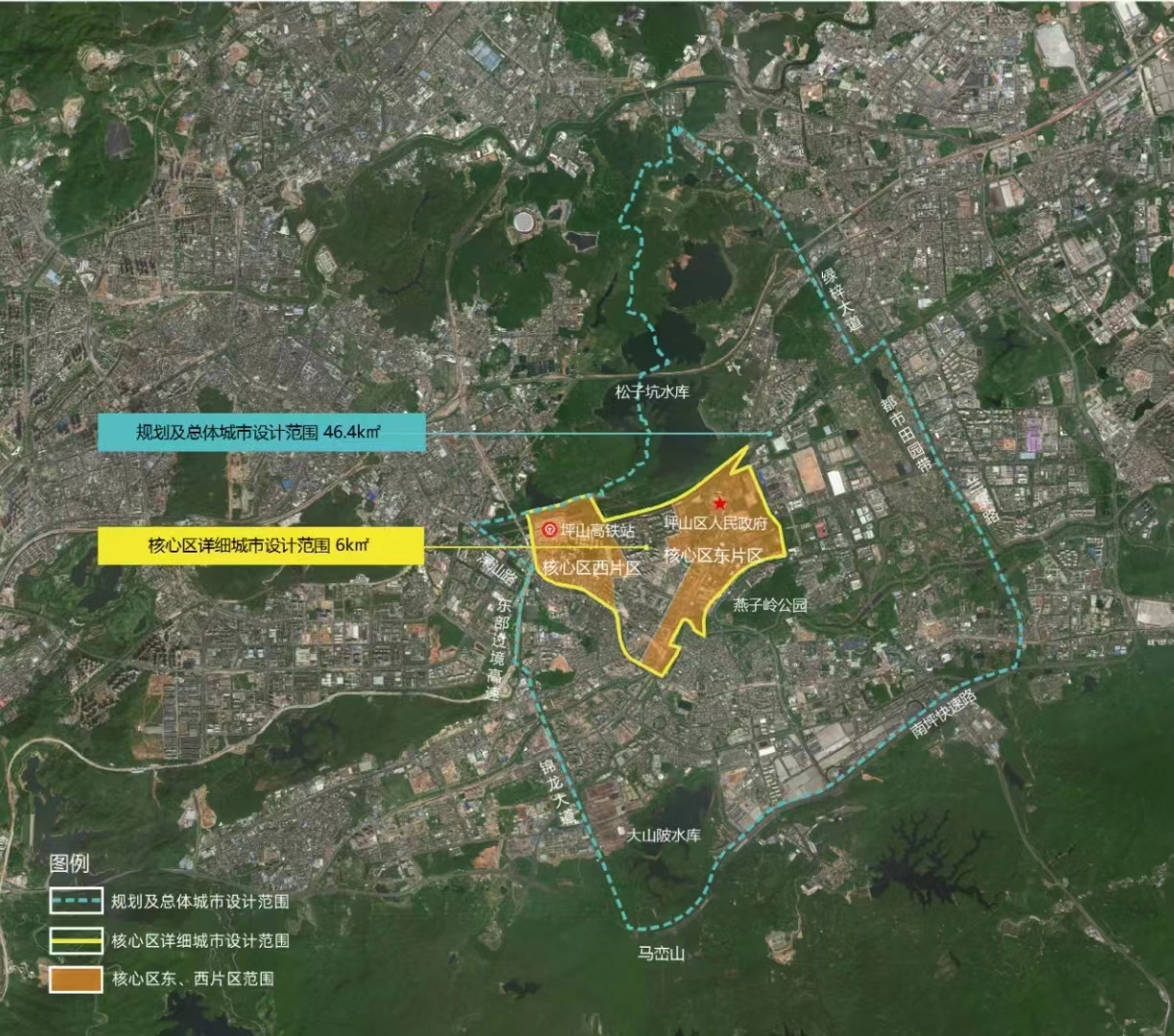 本次国际咨询范围包含三个层面:即研究范围、规划及总体城市设计范围、核心区详细城市设计范围。其中,研究范围包括坪山区全域,并统筹考虑与龙岗区宝龙街道、大鹏新区、盐田区以及惠州市大亚湾经济技术开发区、惠州市惠阳区等周边地区的协调关系;规划及总体城市设计范围,面积约46.4平方公里,东至兰景路,南至南坪快速,西至锦龙大道,北至松子坑水库;核心区详细城市设计范围:核心区面积约6平方公里,东至深圳坪山综合保税区西侧围网,西至深汕路、东纵路,南至金牛路、坪山大道,北至丹梓西路。其中重点对核心区东片区约2.7平方公里、核心区西片区约1.6平方公里开展详细城市设计。