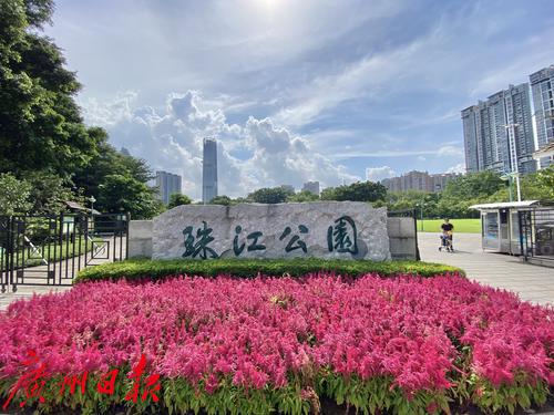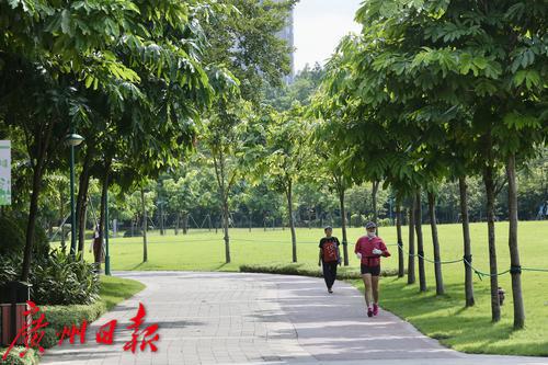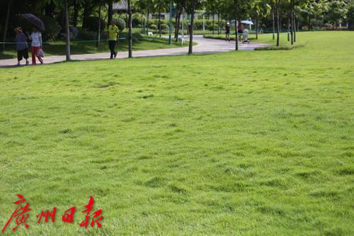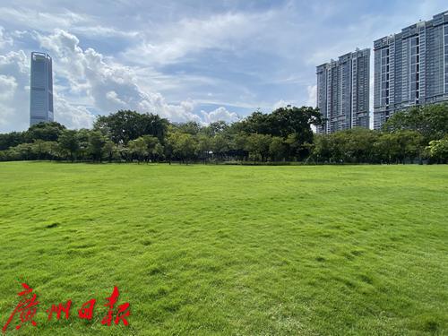 8月23日早晨,珠江新城珠江公园,绿茵草地在阳光照耀下让人心旷神怡,跑步和散步的人们轻盈地享受着绿植的大自然气息。