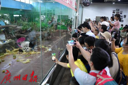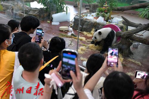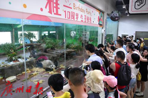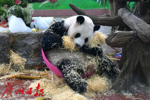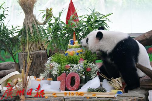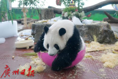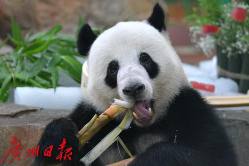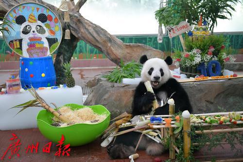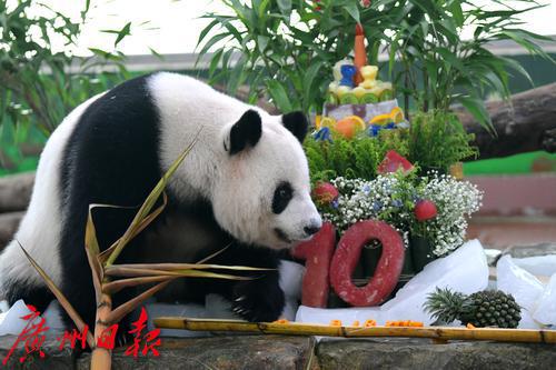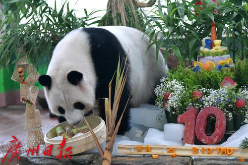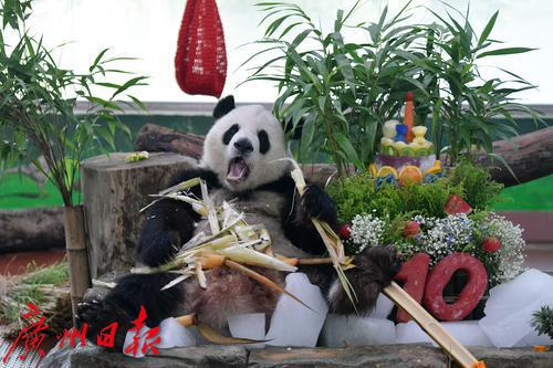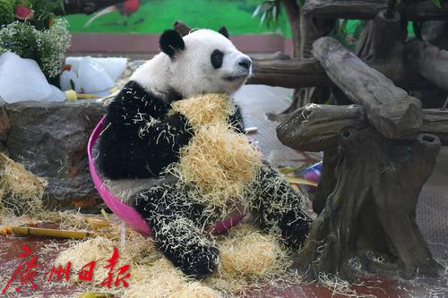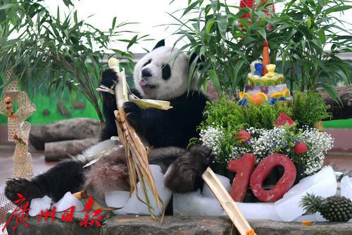 广州动物园大熊猫“星一”、“雅一”的生日分别是8月23日和8月27日,今年是这对大熊猫兄妹的10周岁生日,8月23日上午,广州动物园精心准备了庆生派对,专门为大熊猫们准备了极具广府特色的食物,用竹编箩筐布置“一盅两件”,为寿星送上生日祝福。