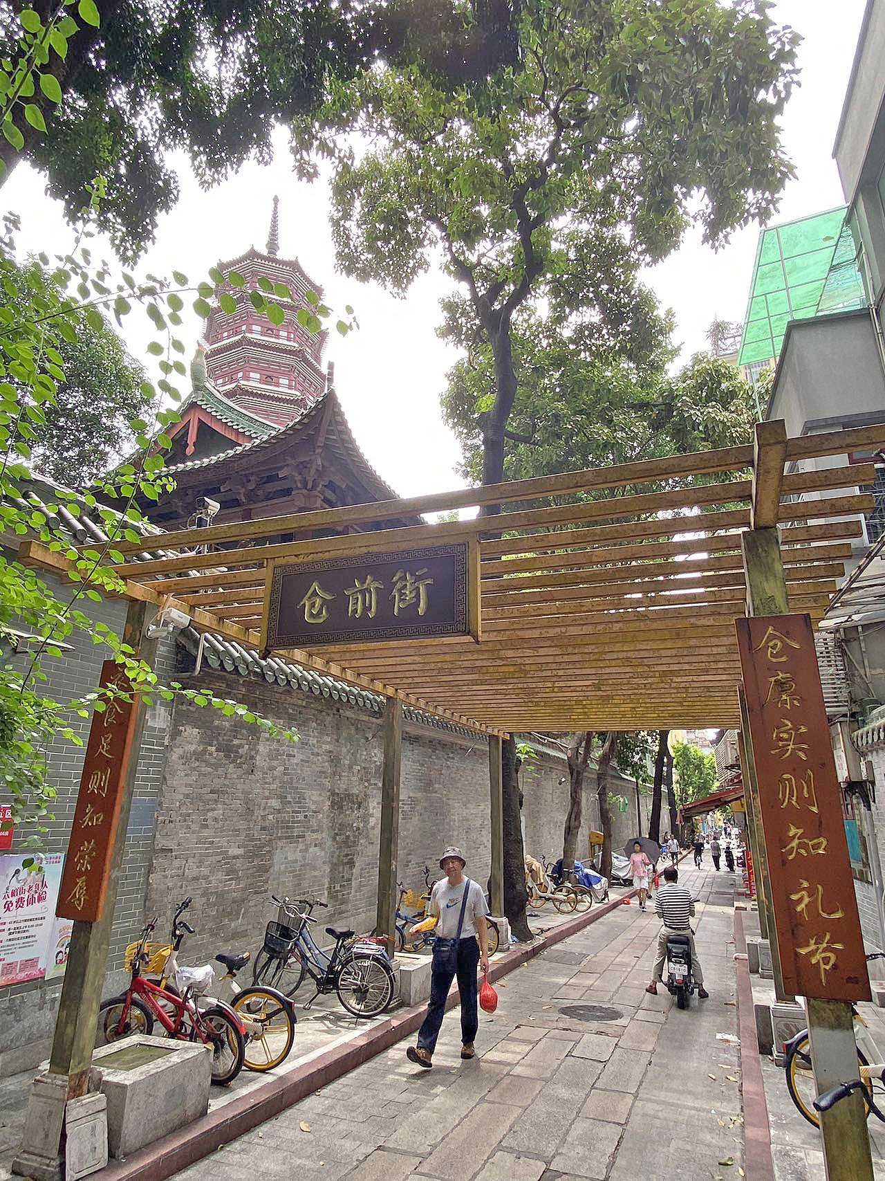 近日,记者在百灵路、六榕路附近找到两条巷子,一条是稻谷仓,另一条是仓前街。清初,驻粤八旗兵在这里建有谷仓,稻谷仓为昔日谷仓之所在,仓前街因位于谷仓之前,故而得名。走到仓前街口,只见书有“仓前街”三个字的牌匾悬在藤架中间,两块竖匾分列两旁,上书《管子·牧民》中的名句:“仓廪实则知礼节,衣食足则知荣辱。”