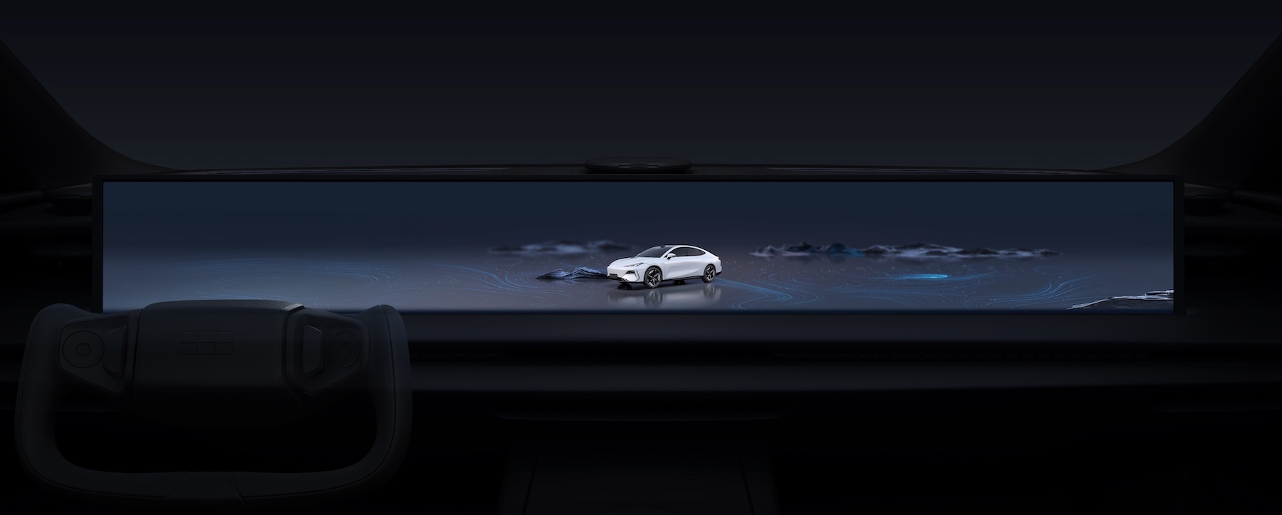 (吉利银河E8的45英寸8K无界智慧霸屏显示效果)