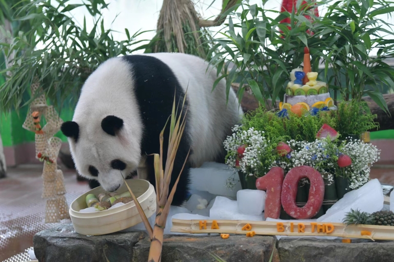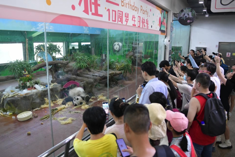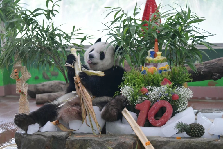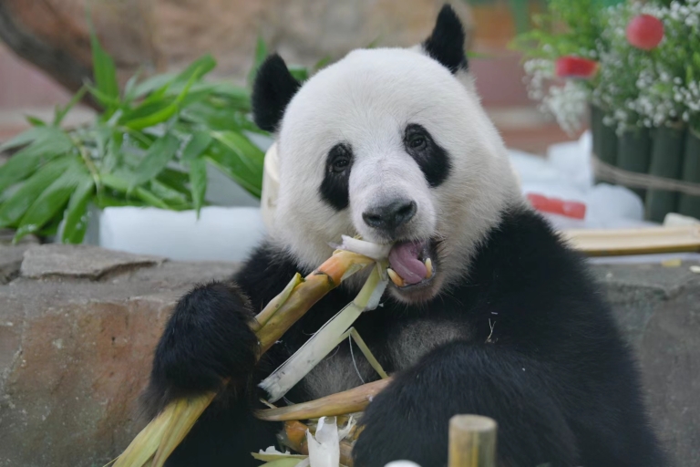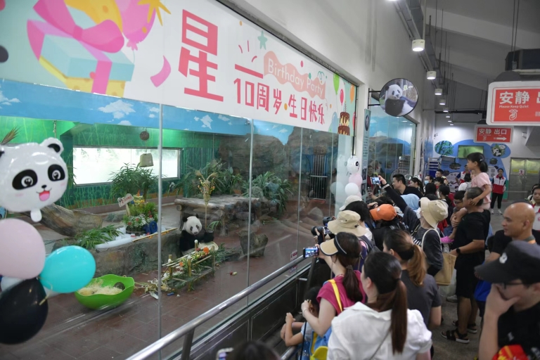 据悉,除了现场直播,今天广州动物园准备了多样科普活动游戏,让现场游客与大熊猫一起趣味过生日。游戏包括猫脸识别、知识问答、科普讲解、趣“尝”竹叶等,让游客在互动中了解更多大熊猫的知识,以及作为旗舰物种的意义。现场设置了拍照打卡区,大熊猫专属印章盖区等,还准备了10周年生日会限量小礼物供游客领取。