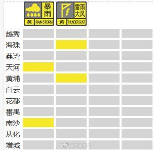 到8月24日9时30分,南沙区暴雨黄色预警信号、海珠区和黄埔区雷雨大风黄色预警信号也已经生效,请注意防御。